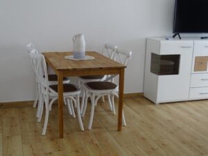 Das Appartement „Hafenkoje“ im Erdgeschoss ist für max. 3 Personen ausgerichtet. Es bietet ein Schlafzimmer, einen Wohn-/Essbereich mit Ausziehcouch, eine Küche, ein Bad mit Dusche und eine kleine Außenterrasse.